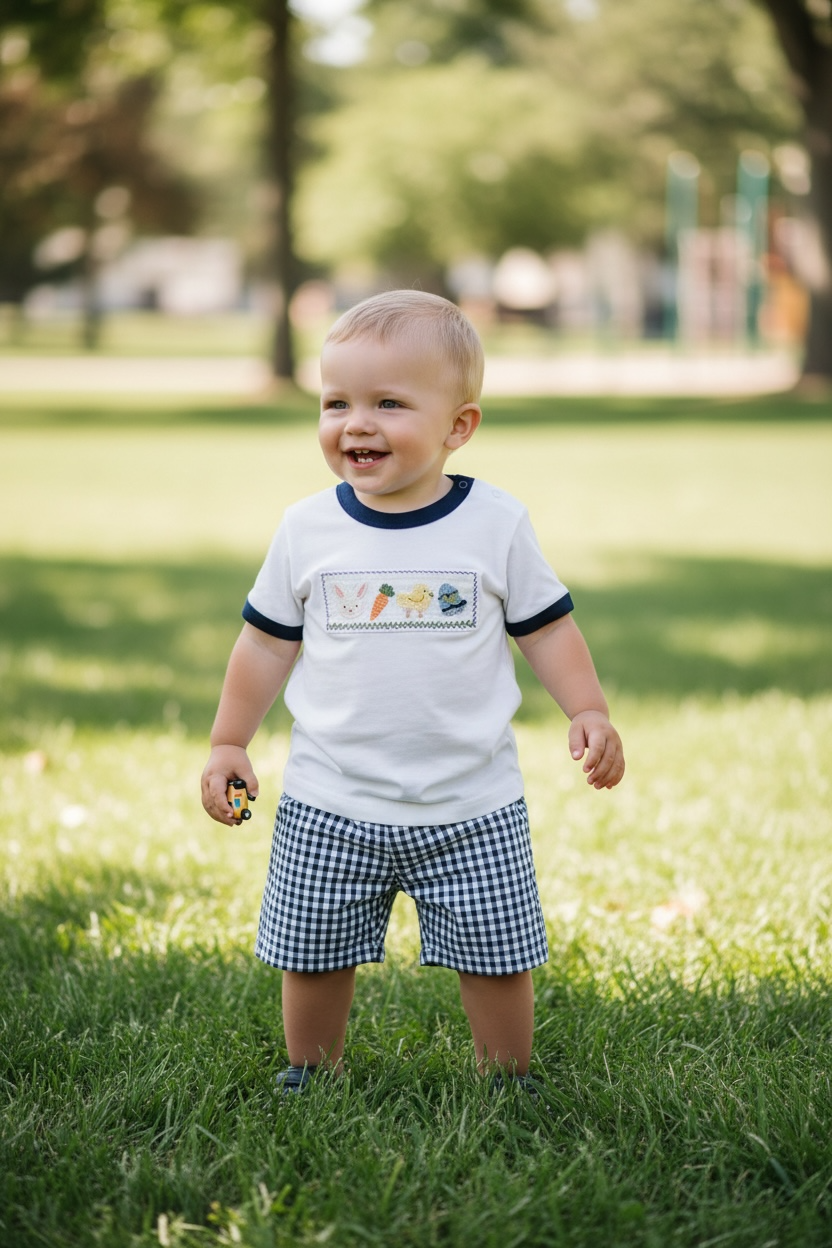 New Easter Mudpie smocked shirt and blue and white shorts size 4t/5t